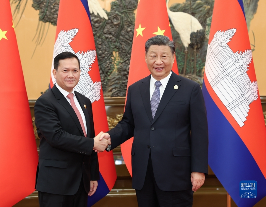 10月19日上午,國家主席習近平在北京人民大會堂會見來華出席第三屆“一帶一路”國際合作高峰論壇的柬埔寨首相洪瑪奈。新華社記者申宏攝