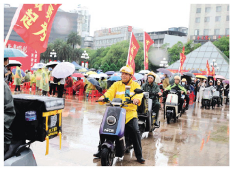 ▲外賣小哥們騎著插著“見義勇為從我做起”、“天地正氣大愛桂林”等標語的車輛,在全市營造見義勇為的氛圍。