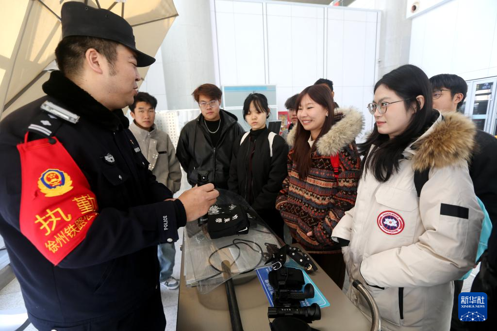1月10日,在上海鐵路公安局徐州鐵路公安處連云港東站派出所舉行的“相約110 與警同行”活動中,民警為旅客介紹警用裝備。
