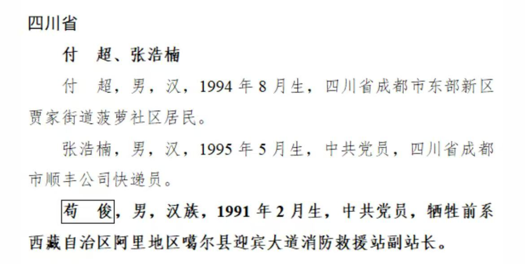 榜單上不幸犧牲的見義勇為勇士茍俊,犧牲前是西藏自治區阿里地區噶爾縣迎賓大道消防救援站副站長。2025年10月28日凌晨2時許,回家探親的茍俊與戰友沿巴中市柳津湖堤壩回家時,突然聽見呼救聲。茍俊發現兩名女子正在湖水中掙扎。他立即跳入湖中,快速游至落水女子陳某身邊,將其推至岸邊,又轉身向另一名落水女子岳某游去。岳某在水中不斷掙扎,體力消耗殆盡,難以浮出水面。茍俊一次次將岳某托舉,但多次滑落,茍俊仍堅持推著她向岸邊緩慢移動。茍俊兩次施救,體力不支、沉入水中。在岸上群眾幫助下岳某獲救,茍俊經搶救無效不幸犧牲。