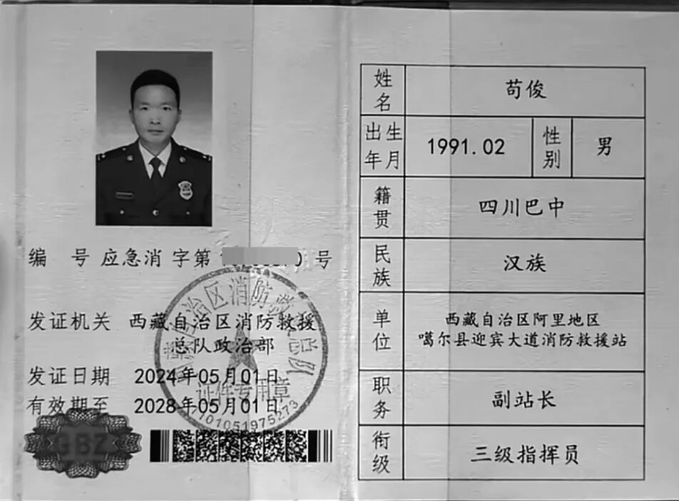 茍俊犧牲前系西藏自治區阿里地區噶爾縣迎賓大道消防救援站副站長。巴中市委政法委供圖