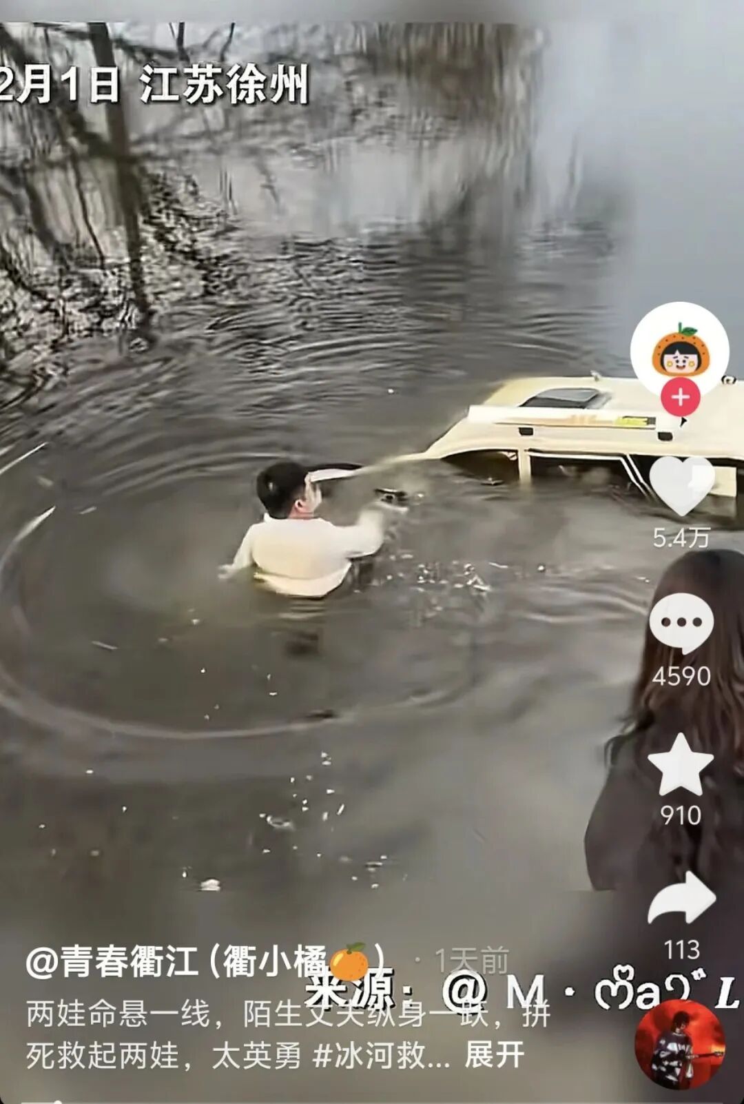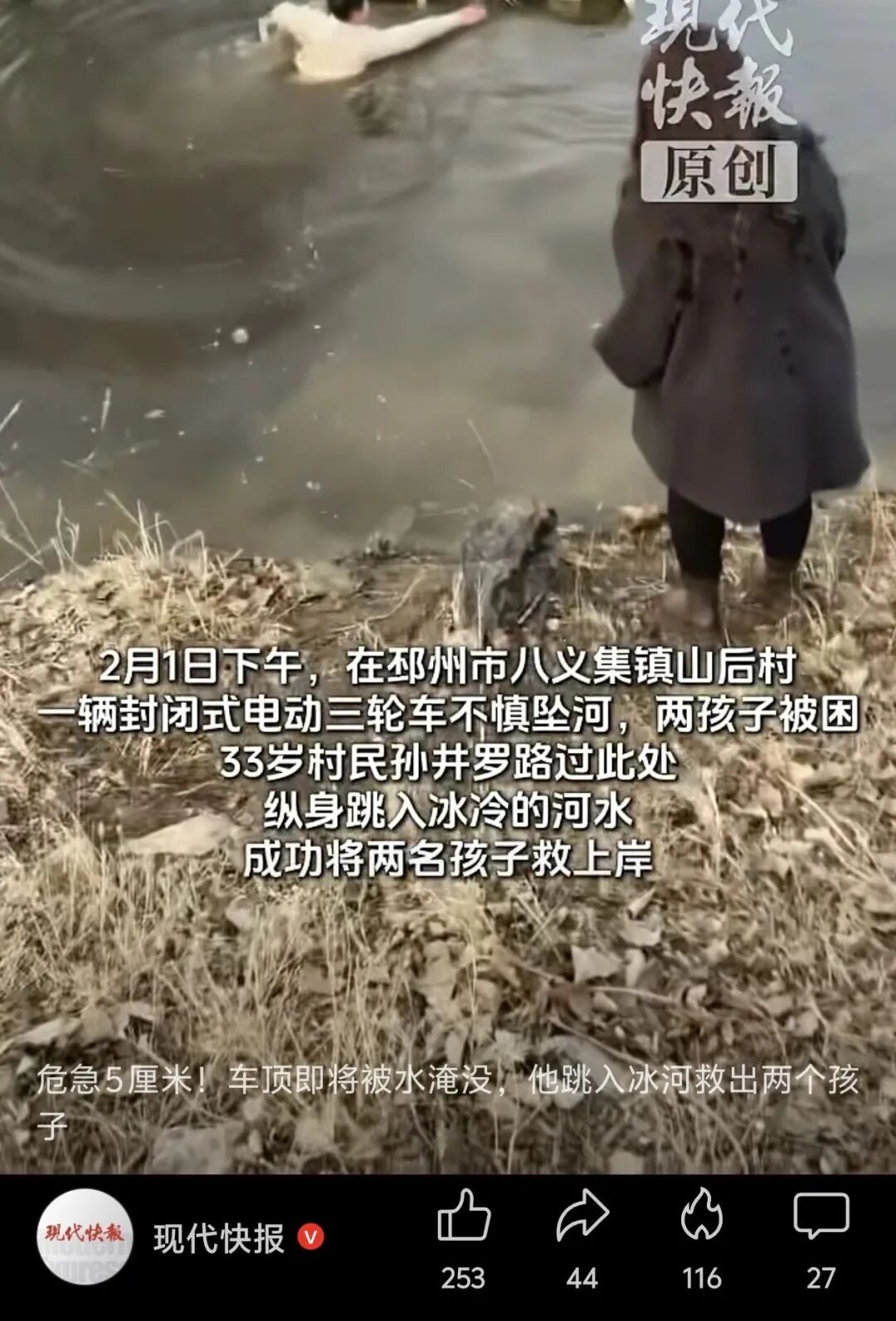 2月1日16時許,在八義集鎮山后村糧窩橋頭,兩名人員騎電動三輪車不慎沖入河中。車輛急速下沉,生命危在旦夕。此時,驅車路過的孫井羅聽到岸邊群眾急切呼救:“車里還有人!”他沒有絲毫猶豫,迅速停車沖向河岸。