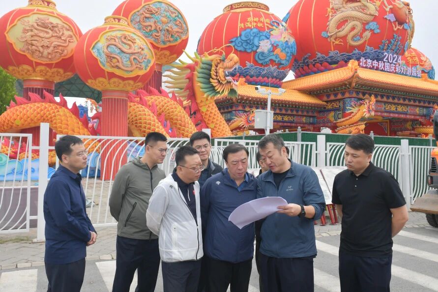 ▲董亦軍(右三)在2024中秋國慶彩燈會舉辦前夕,前往游園會現場對人員、車輛路線進行調研。
