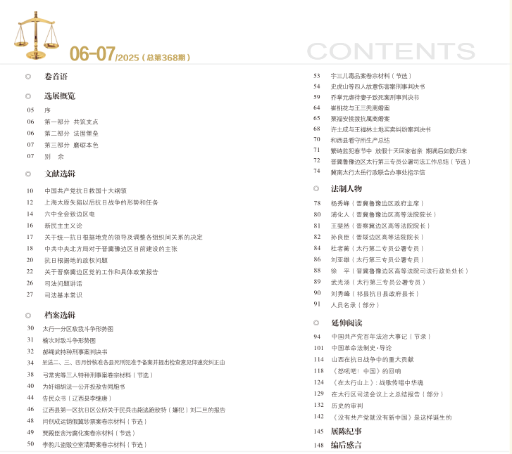 本期《山西審判》專輯精心設置了“選展概覽”“文獻選輯”“檔案選輯”“法制人物”“延伸閱讀”“展陳紀事”等板塊,圖文并茂,內容豐富生動。從中,我們能夠看到根據地司法工作者們在戰火紛飛的歲月中所進行的艱苦探索,感悟他們的司法智慧,包括對黨的事業無限忠誠、對公平正義的不懈追求、對人民群眾的深切情懷等等,以及在推動司法制度完善、形成優良司法作風等方面取得的豐碩成果。