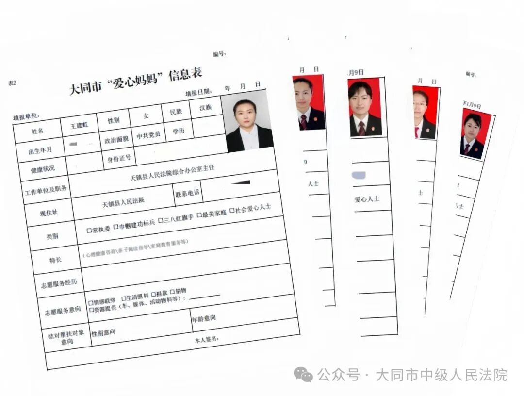 姓名:王建虹,性別:女,民族:漢族,出生年月:1986年04月,政治面貌:中共黨員,工作單位及職務:天鎮縣人民法院綜合辦公室主任,特長:心理健康咨詢、親子閱讀指導、家庭教育服務,志愿服務意向:情感聯絡、生活照料、捐款、捐物、資源提供……5張信息表登記入冊以后,正式宣告5名干警成為“愛心媽媽”。