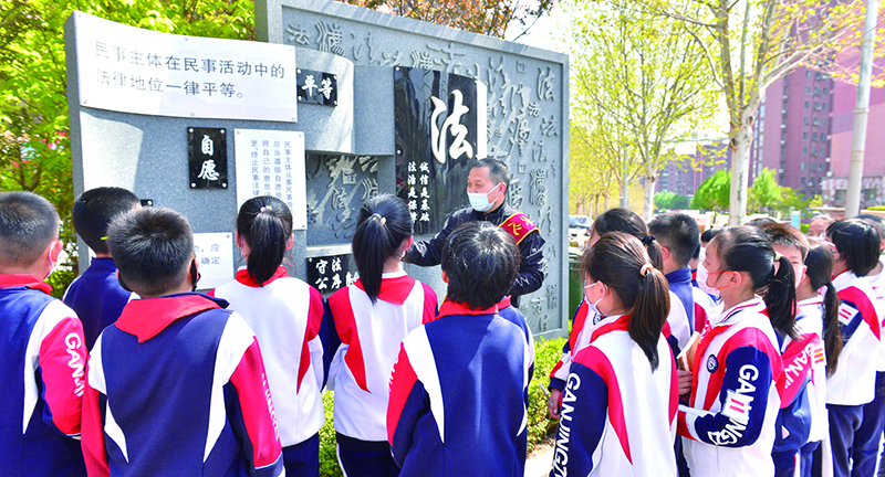 普法志愿者在憲法墻前給學生們普及法律知識