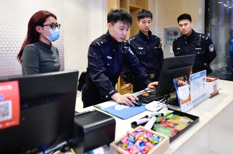 (長(zhǎng)春市公安局二道區(qū)分局東盛路派出所民警在轄區(qū)一家賓館巡檢 許暢 攝)