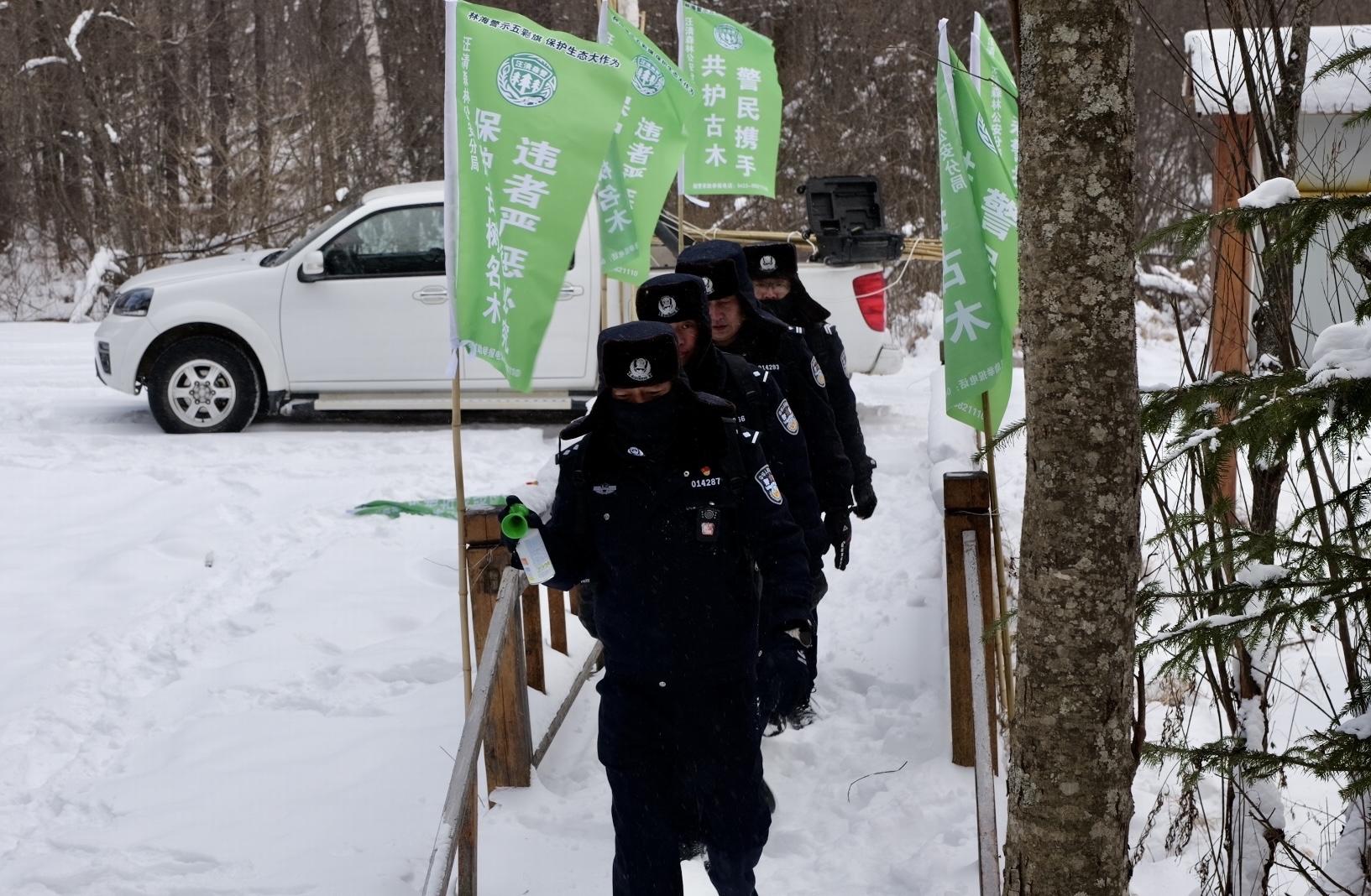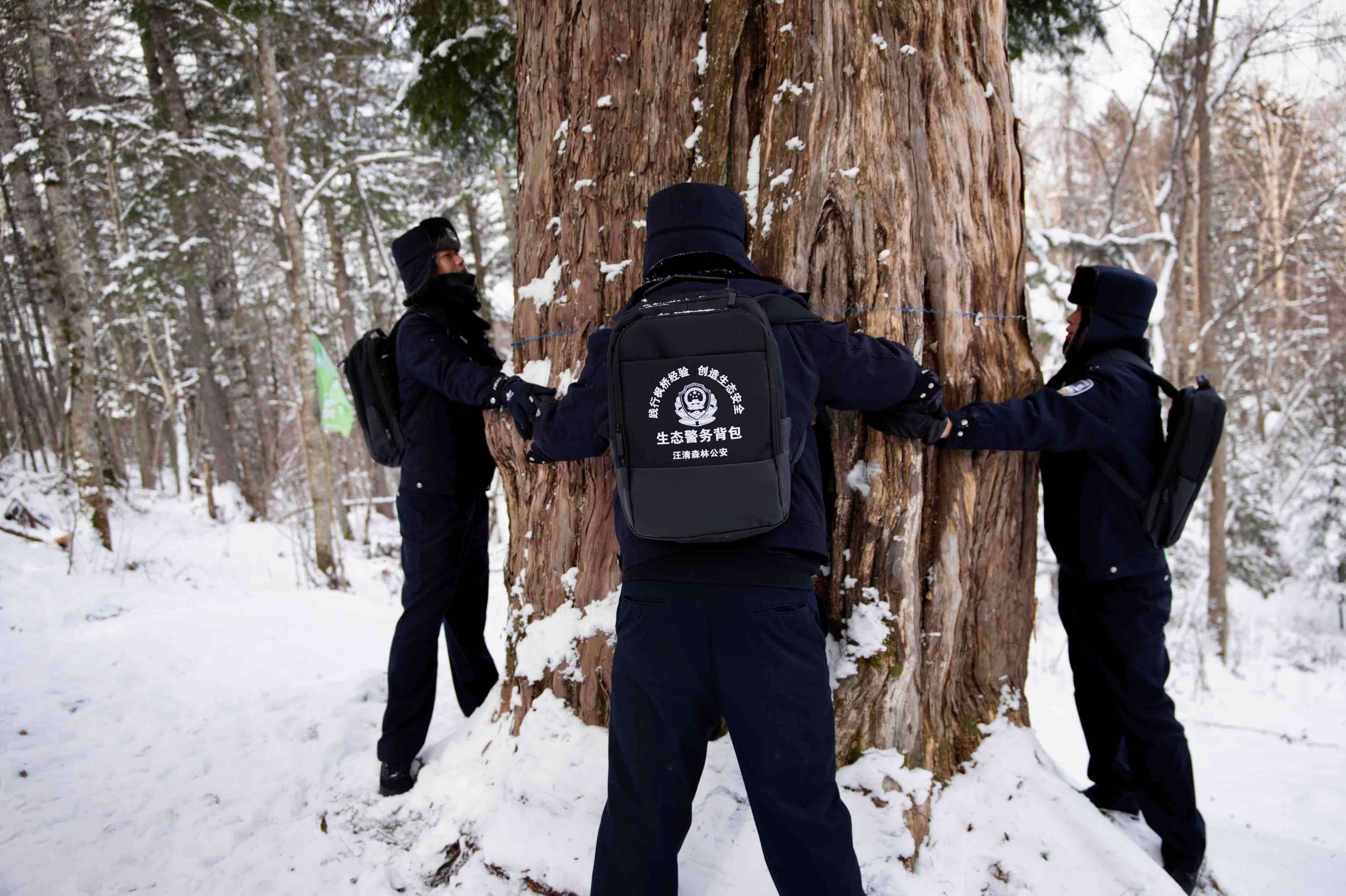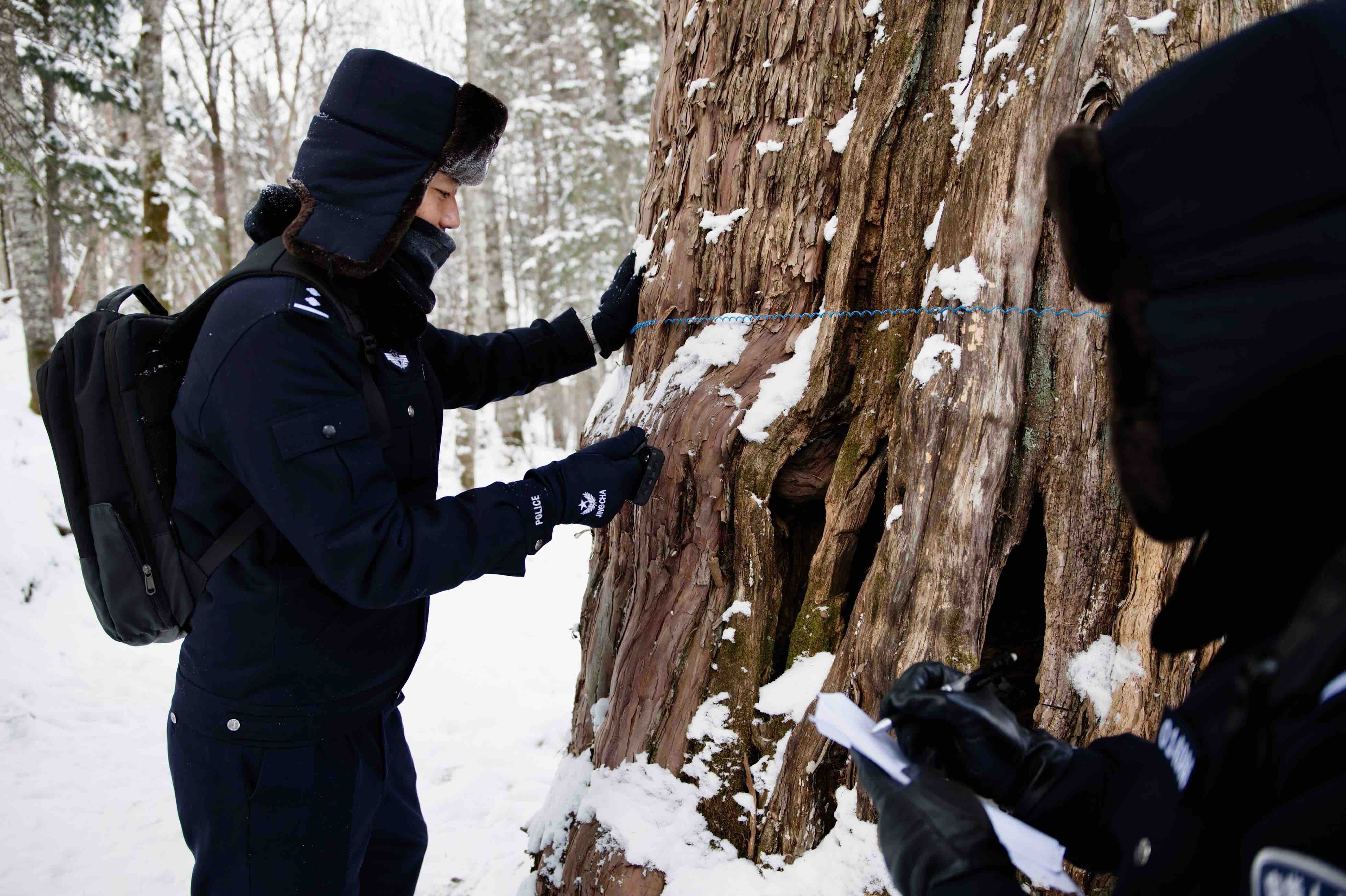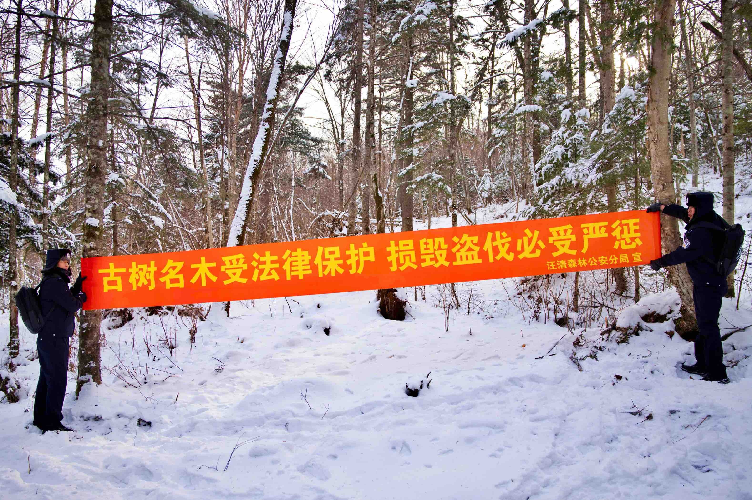 12月初的一場降雪,覆蓋了汪清廣袤的林區,水墨山林,一抹藏藍穿梭其間,那是吉林省公安廳森林公安局汪清森林公安分局金蒼森林派出所的民警們正在巡山。此行的目的是巡護一棵3000多年的紅豆杉是否被雪壓斷樹枝和遭到人為破壞及生長情況,再懸掛保護古樹的條幅和標語。