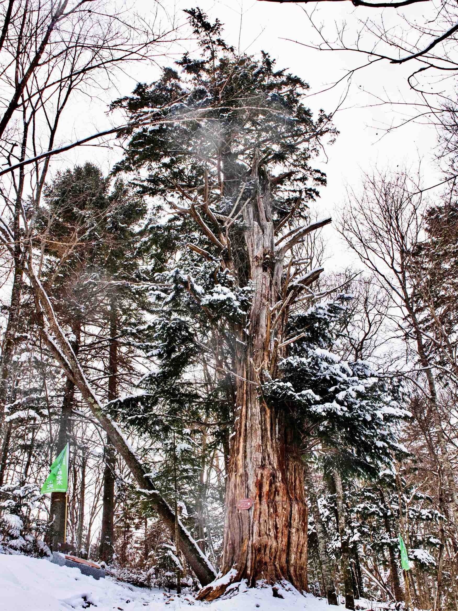 行至汪清林區荒溝林場63林班,沿著山路拾級而上,風吹在臉上猶如刀割,順著大衣領口直沖身體,民警們深一腳淺一腳的地前行,積雪順著鞋口灌進鞋內,一股涼氣瞬間從腳掌傳遍全身。事實上,民警們習慣了這樣惡劣的天氣,滑倒,就爬起來,手凍麻了,摘下手套呼一口熱氣暖一暖……半小時后,一棵3000多年紅豆杉展現在大家面前,20余米身軀直沖云霄,1.68米的胸徑環抱年輪,歷經千年歲月依然屹立挺拔,這棵紅豆杉需五個成年人才能環抱過來。即便在冬日,枝葉仍倔強地保持著翠綠,與潔白的雪相互映襯,構成了一幅絕美的畫卷。