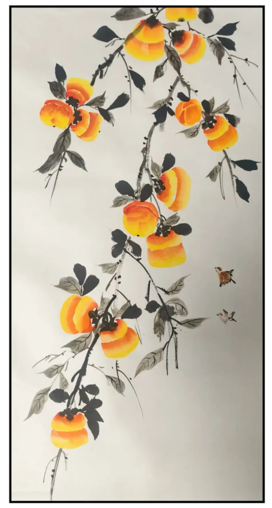 這幅國畫以“柿”寓“事”,繪滿樹橙黃柿子與靈動小鳥,取“柿柿如意”之吉祥意。值雙節同慶,祝愿生活順遂、家國安康!