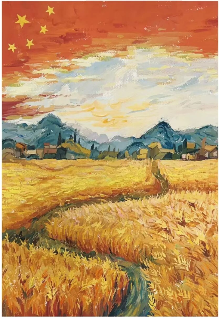 以豐收麥田為景,輔以村莊遠山與祥云,五星紅旗飄揚其間。紅黃主色調傳遞莊重與喜悅,禮贊祖國繁榮。