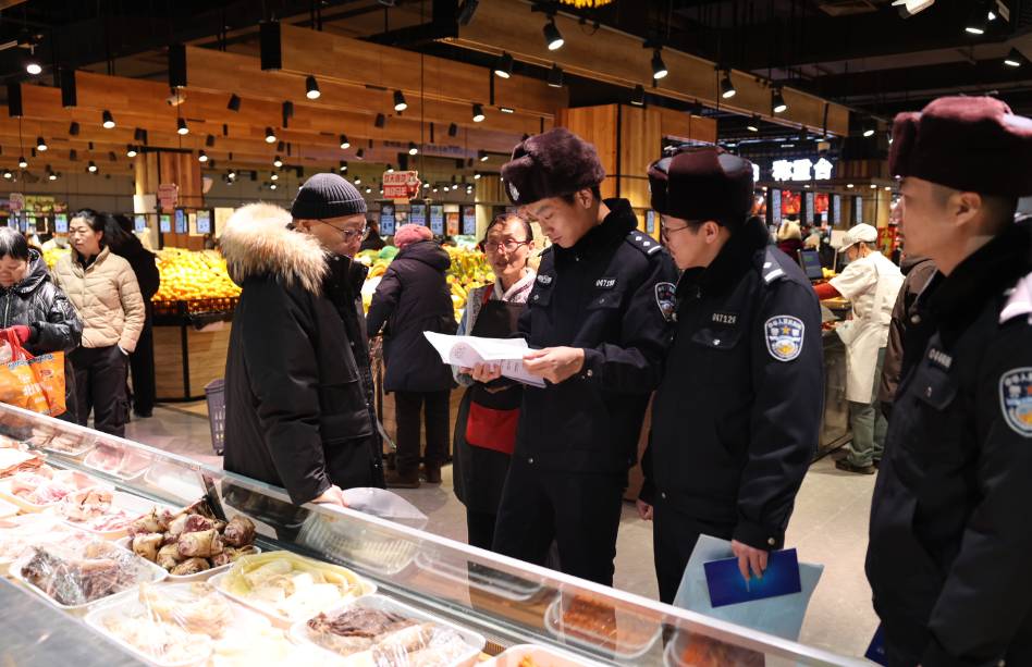 超市貨架前,民警的身影同樣忙碌。他們重點排查米面油、糕點、熟食制品等熱銷年貨,仔細查看包裝上的生產日期、保質期等方面內容。