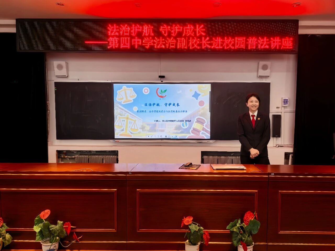 解讀新法第四站:邁入第四中學,刑事審判庭法官荊思源聚焦初中生成長特點,結(jié)合未成年人違法犯罪典型案例,從打架斗毆等不良行為入手,剖析青少年違法犯罪根源。重點解讀《中華人民共和國治安管理處罰法》中未成年人專門教育及校園欺凌相關(guān)規(guī)定,指出校園欺凌與黑惡勢力密切相關(guān)——部分黑惡勢力通過誘導、脅迫未成年人參與欺凌,將其拉入犯罪泥潭。“青春逢盛世,奮斗正當時”,告誡引導學生認清危害,時刻繃緊法治之弦,做尊法學法用法守法的新時代青少年。