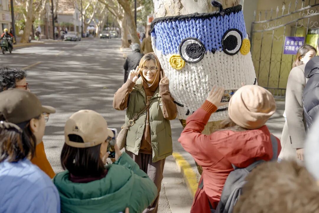 快閃店門口,身披滬小法形象“毛衣”的大樹格外吸睛。滬小法的設計靈感源于上海高院大樓的雛鳥造型和《山海經》中的傳信神鳥,其昵稱“青團”更是自帶上海本地特色,它就像法治文化的傳播使者,在街區里扎根,將公平正義的“佳音”傳遞到群眾心中。