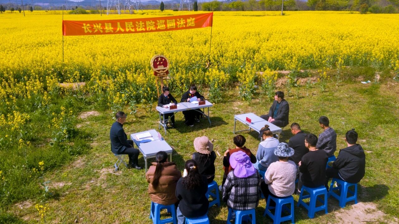 黃萼裳裳,花香滿溢。今年春天,隨著法槌的敲響,一場涉農用無人機作業的侵權糾紛巡回審判在泗安的花田下進行,幾十名村民和部分農業專家現場旁聽。