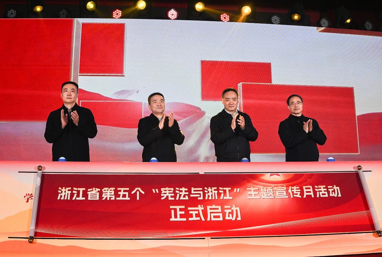 12月4日,在第十二個國家憲法日到來之際,浙江省第五個“憲法與浙江”主題宣傳月活動啟動儀式在杭州舉行。此次宣傳月主題是“學習宣傳貫徹習近平法治思想,推動憲法深入人心”。省委常委、政法委書記王成國,省人大常委會黨組成員、副主任趙光君,省人民政府副省長、省公安廳廳長楊青玖,省政協(xié)黨組副書記、副主席王昌榮出席并啟動主題宣傳月活動。