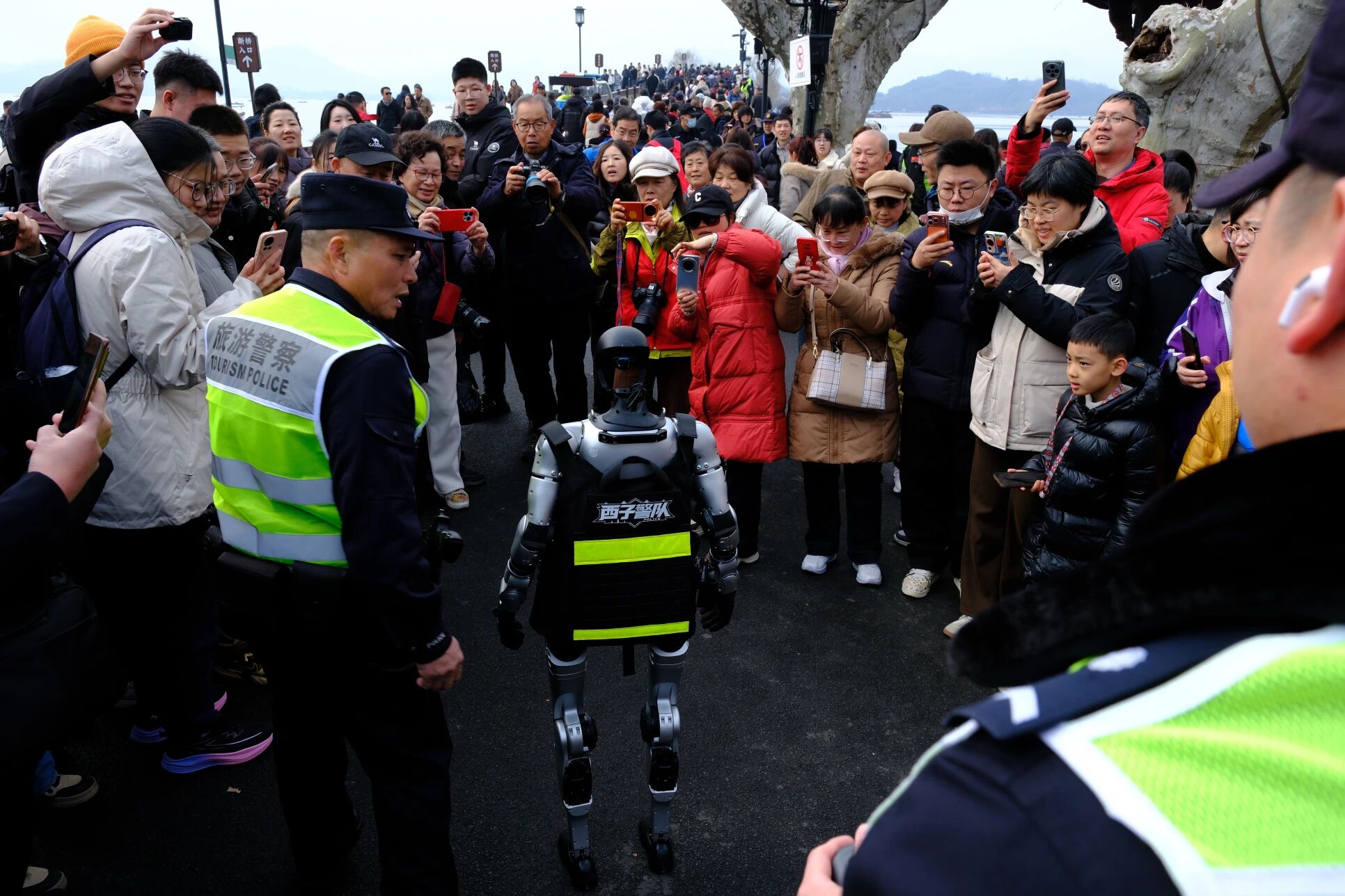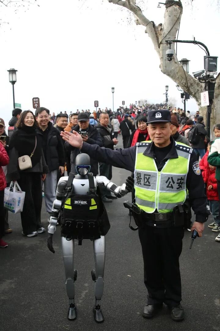當天上午十點,老陳和同事們正在人流中穿梭疏導,一陣輕柔的機械運轉聲和游客的驚喜歡呼從身后傳來,一位圓頭圓腦的人形機器人,身著定制款“西子警隊”執勤馬甲,穩步走向陳宗耀,主動開口問好:“陳警官新年好!我是新來的同事,今天向您報到!”
