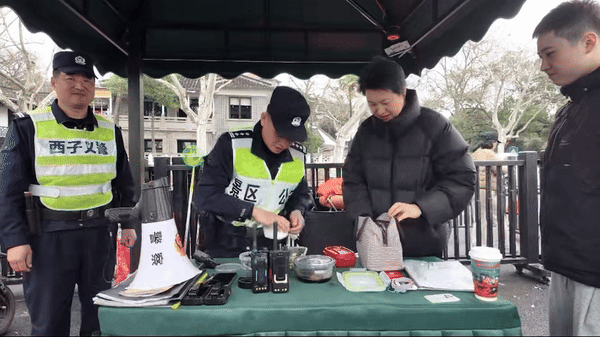 中午時分,客流迎來短暫平緩,陳宗耀正靠在崗亭旁喝水休息,“斷橋小白”則在一旁待命。就在這時,一個熟悉的身影出現在崗亭不遠處——妻子徐小麗和女兒一起,正朝著他揮手:“爸爸,我們給你送午飯啦!”