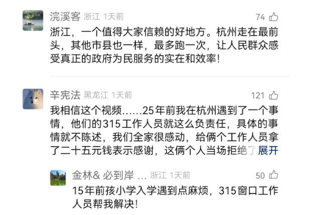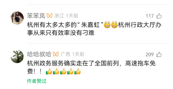 謝先生特意錄了一段視頻感謝朱珈虹,“她不是在一個崗位上機械重復,而且在認真聽取群眾需求,思考怎么解決問題。可能這就是杭州效率的縮影。”對此,不少網友留言點贊:“一點不意外,這就是杭州!”
