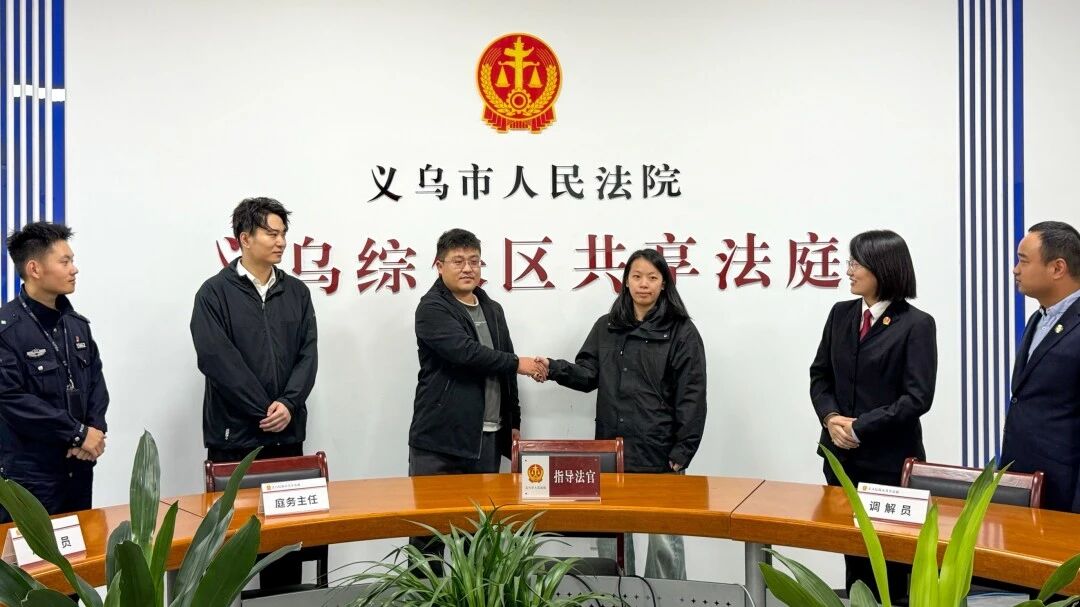 義烏綜合保稅區共享法庭成功調解首起案件,雙方當事人握手言和。