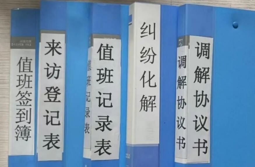 “電話就印在海報上,貼在每個樓棟,并且發到小區的公眾號上和每一個樓棟群里,讓居民們有事先能想到我們。”調解員王老師展示著值班表和工作日志。