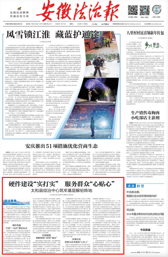 近年來,安徽阜陽太和縣綜治中心緊扣“實”字核心要義,從硬件建設、機制構建到服務落地層層發力、久久為功,為群眾“找說法、解難題、化心結”提供堅實陣地,成為矛盾糾紛化解的“終點站”。從硬件支撐的“實打實”、機制運行的“硬碰硬”到服務群眾的“心貼心”,該縣綜治中心以“實”字貫穿工作全過程,推動大量矛盾糾紛化解在基層、消除在萌芽狀態,筑牢平安太和建設根基。