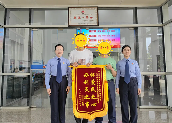 涉罪未成年人及其父親專程來到廈門市思明區檢察院,向檢察官送來一面錦旗
