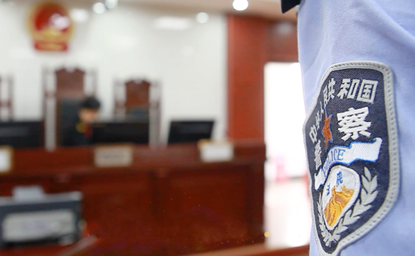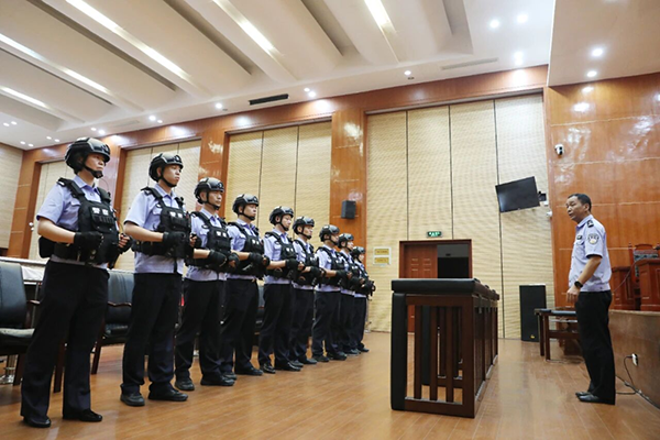 9時(shí),案件如期開(kāi)庭。被告人輪流接受法庭詢問(wèn)和調(diào)查,在他們身后,兩名法警目光如鷹,聚精會(huì)神地關(guān)注著現(xiàn)場(chǎng)動(dòng)態(tài)。汗水已將警服浸濕,法警巋然不動(dòng)。
