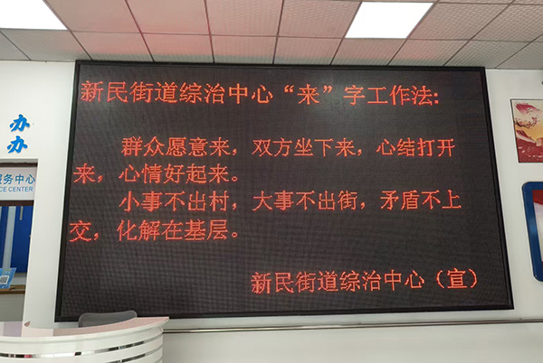 新民街道綜治中心的大屏上播放著的“來”字工作法