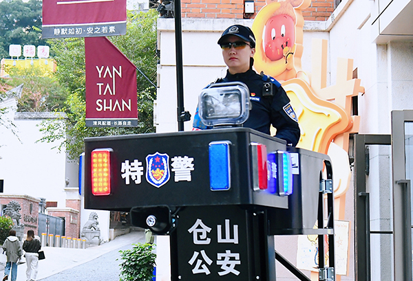 周末的煙臺(tái)山歷史風(fēng)貌區(qū),紅磚古厝映著網(wǎng)紅店鋪的霓虹,“煙嵐”女子機(jī)動(dòng)隊(duì)隊(duì)員林子欣為幾位外地游客指引路線。