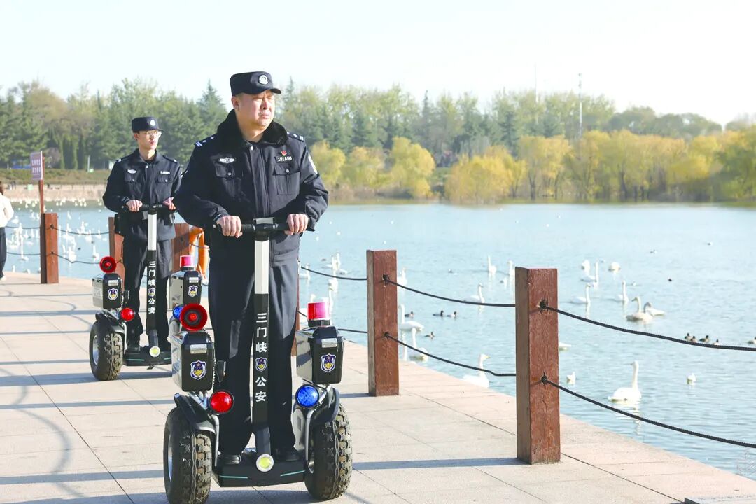 三門峽市公安局環食藥偵支隊民警在天鵝湖巡邏