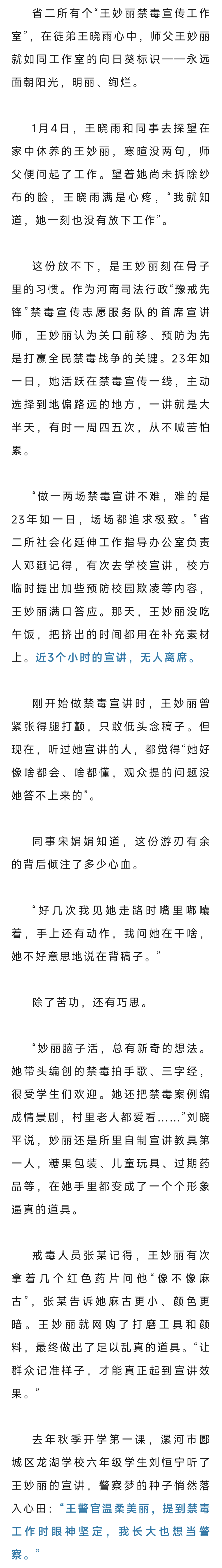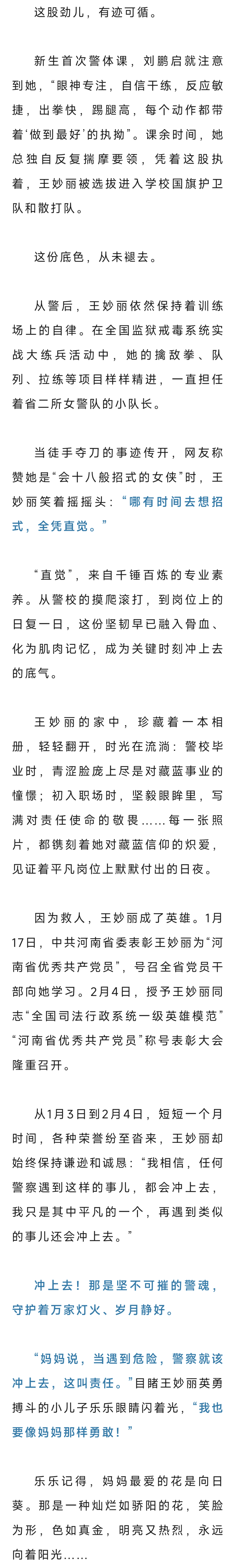 事跡傳回母校河南司法警官職業(yè)學(xué)院,當年的輔導(dǎo)員劉鵬啟既擔心又驕傲,“假期,便裝,還帶著孩子,她就算沒站出來,誰還能說些什么?可她呢,還是學(xué)生時代那個王妙麗”。