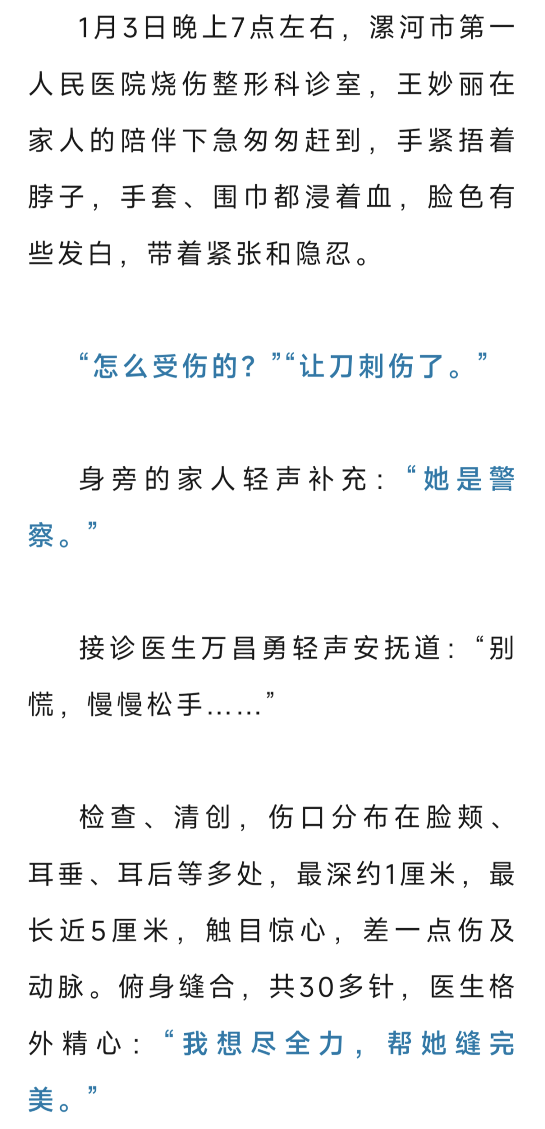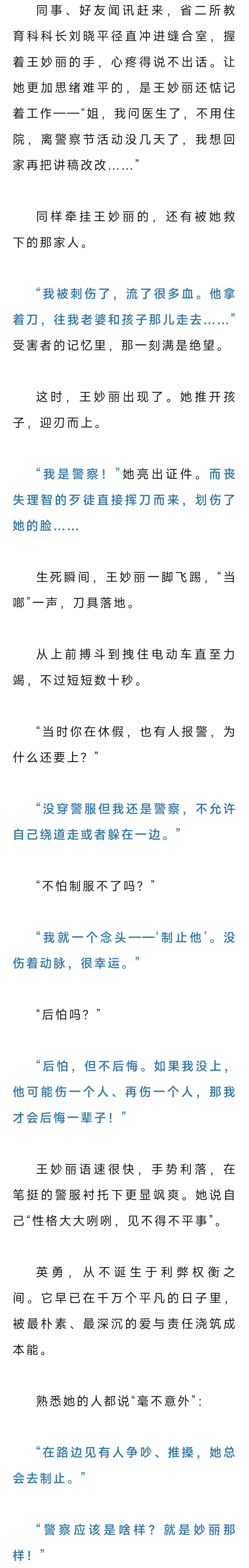 那是1月3日,休假中的王妙麗帶著孩子外出。路口,兩名男子的爭執(zhí)驟然升級,一人竟掏出了刀。她一把將孩子推到旁邊,自己沖了上去,徒手奪刀、被刀劃傷、把刀一腳踢飛……歹徒跳上電動車企圖逃離,而她一手捂著流血的脖頸,另一只手,死死拽住開足馬力的車身。