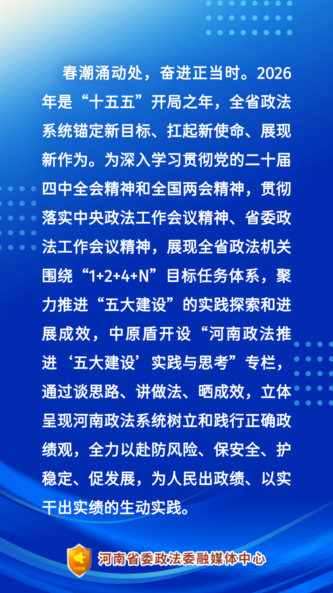 2026年,全省法院將嚴格落實省委部署要求,堅持“夯實基、務實功、出實績”工作主線,通過夯基鑄魂,以信念堅定筑牢絕對忠誠根基;夯基提質,以理念重塑促推辦案質效躍升、群眾滿意度提升;夯基賦能,以素能提升鍛造過硬法院隊伍;夯基進階,以品牌創建繪就工作嶄新圖景。一步一個腳印,踏踏實實干好工作,更好發揮司法懲罰犯罪、保護人民,定分止爭、維護公正職能作用,努力為平安河南法治河南建設提供更高水平的司法服務和保障。