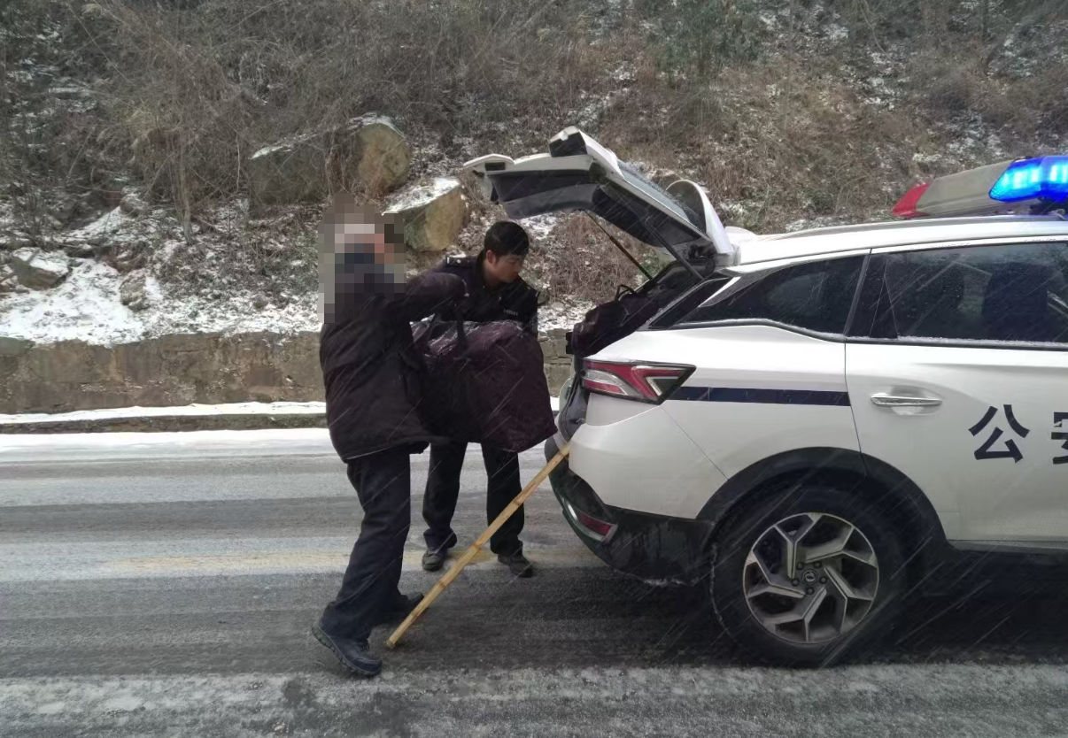 ▲十堰交警護送在G246國道上負重獨行老人安全回家