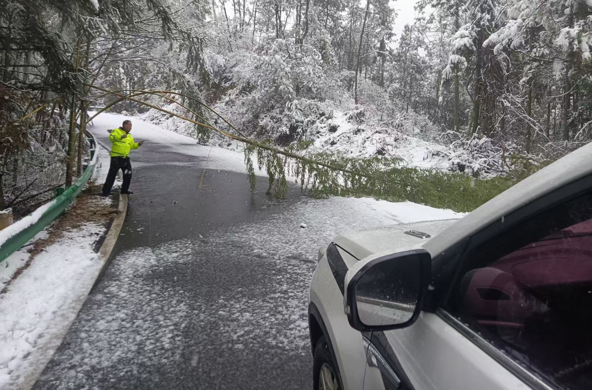 ▲黃岡交警深入三角山景區,清理路面倒伏樹干保障安全暢通