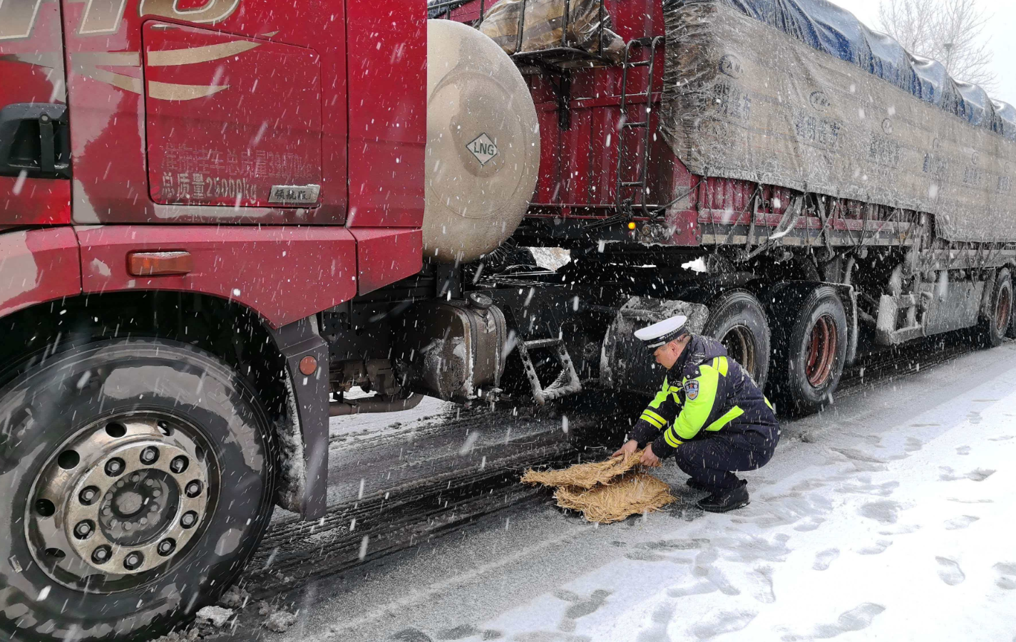 ▲十堰交警在209國道積雪路段幫過往車輛安裝防滑鏈