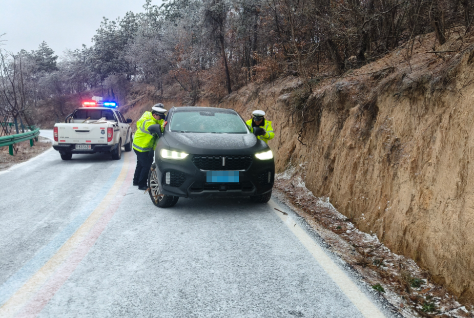 ▲十堰交警在楓土路提醒過往車輛冰雪天氣路面濕滑、減速慢行