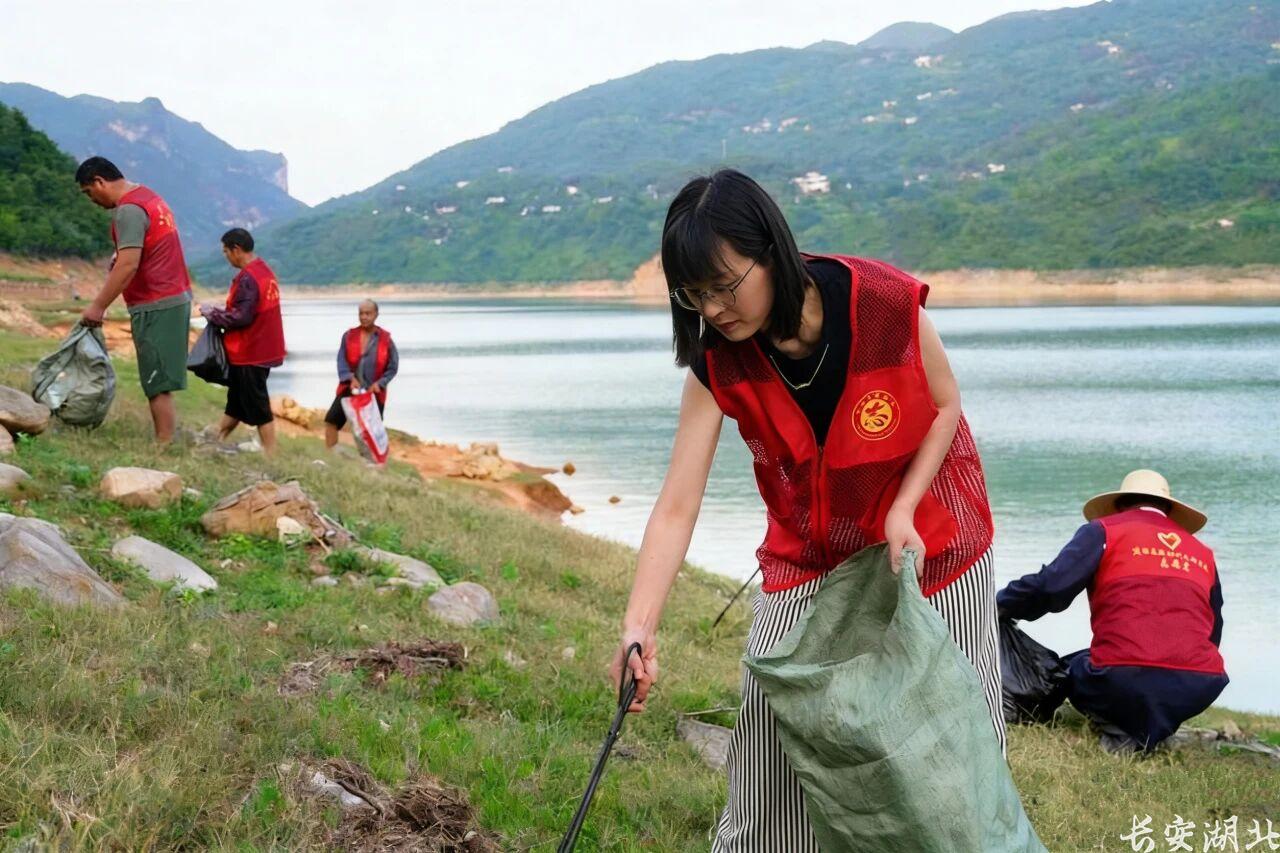 本文作者、湖北省人大代表黃彩森(右二)正帶領(lǐng)村民清理清江岸邊垃圾