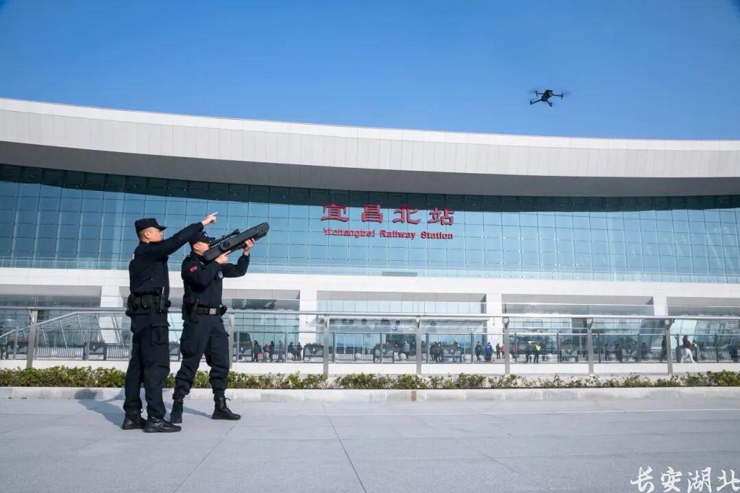 ▲夷陵區(qū)公安分局民警在宜昌北站區(qū)域開展處置“黑飛”無人機訓練