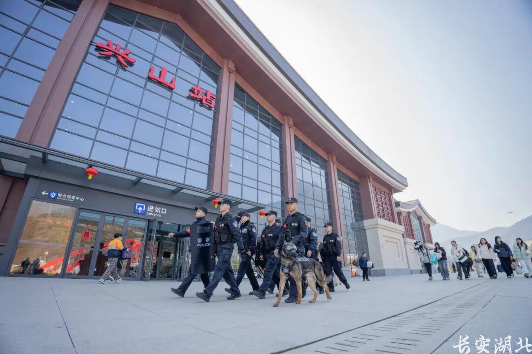 ▲興山縣公安局民警攜警犬在人員密集場所巡邏