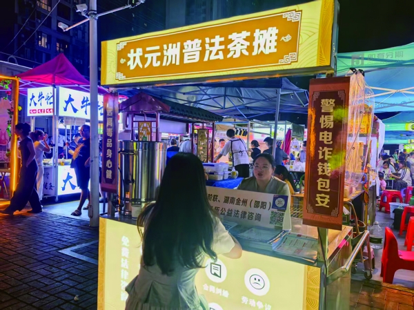 邵陽市司法局聯(lián)合湖南金州(邵陽)律師事務(wù)所、狀元洲街道設(shè)立的“狀元洲普法茶攤”。