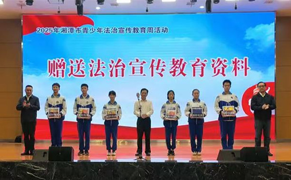 2025年湘潭市青少年法治宣傳教育周活動現場,向學生代表贈送法治宣傳教育資料。