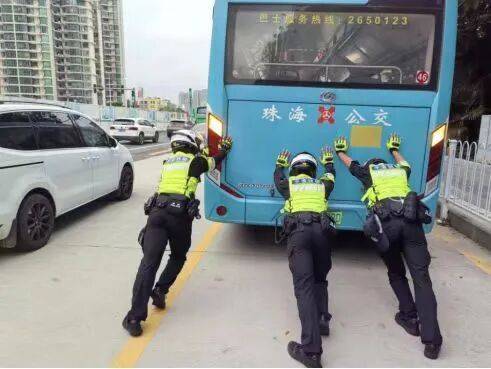圖為鐵騎隊員幫助推動故障公交車