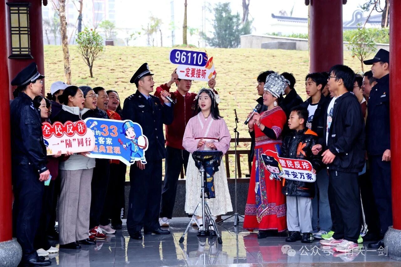 近日,在陸川縣文昌公園,陸川縣公安局民警與身穿民族服飾的山歌手一同唱響禁毒、反詐主題山歌。