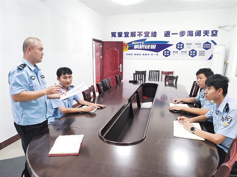 白沙邦溪派出所民警林豐和同事研判案情。記者宋飛杰 攝