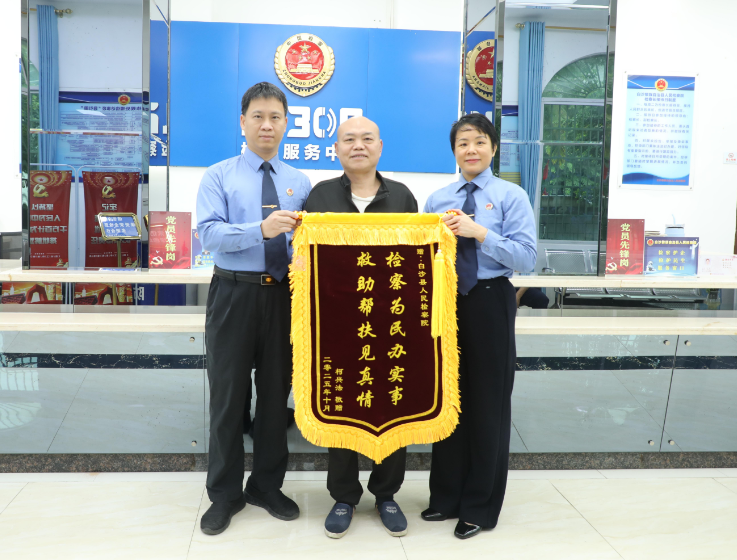 為了表示感謝,柯某將一面錦旗和一封感謝信交給白沙檢察院第三檢察部檢察官廖夢和第四檢察部主任曾繁平。
