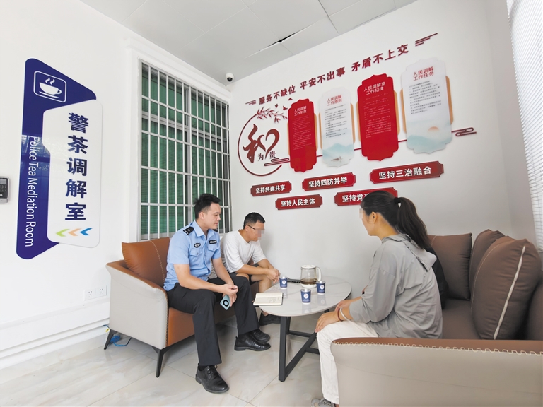 “一杯涼茶消火氣,一番調(diào)解化矛盾。”在崖州灣科技城派出所,有一間溫馨的“警茶調(diào)解室”,如今已成為化解矛盾的陣地。在這里,調(diào)解員遞上清熱解暑的涼茶,用情感人、以理服人,聯(lián)動區(qū)綜治中心、司法局等部門工作人員,借助法院線上調(diào)解終端,實(shí)現(xiàn)矛盾糾紛一站式化解。