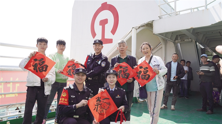 2月2日,海口鐵路公安處南港站派出所民警在粵海鐵路輪渡上為旅客送“?!弊趾推辗ㄐ麄?。通訊員符曉日 攝