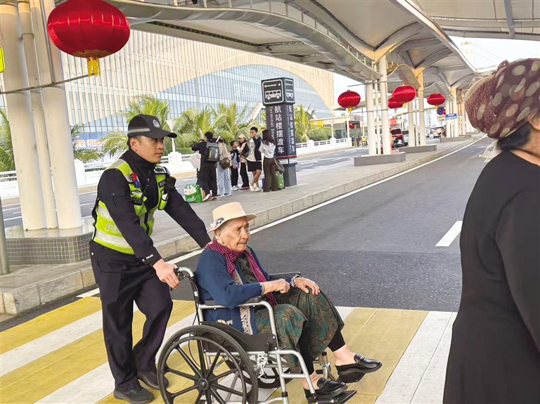 2月2日,省公安廳機場公安局交通管理支隊民警為行動不便的老人提供幫助。記者黃君 攝